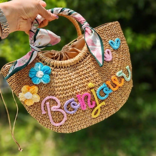 【オーダーメイド】名入れ草編みバッグ07・夏の織りハンドバッグ 手作り・大容量トート